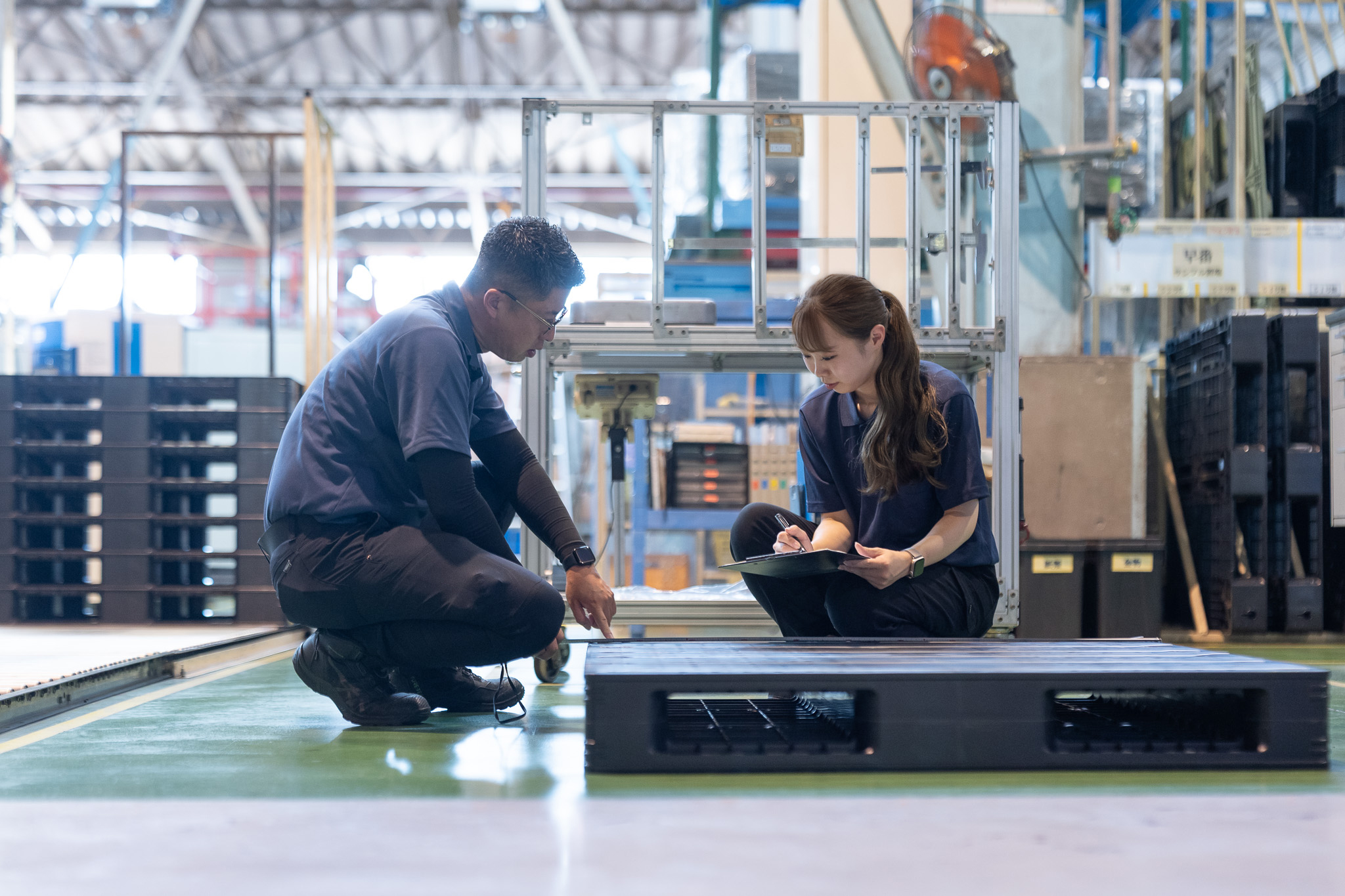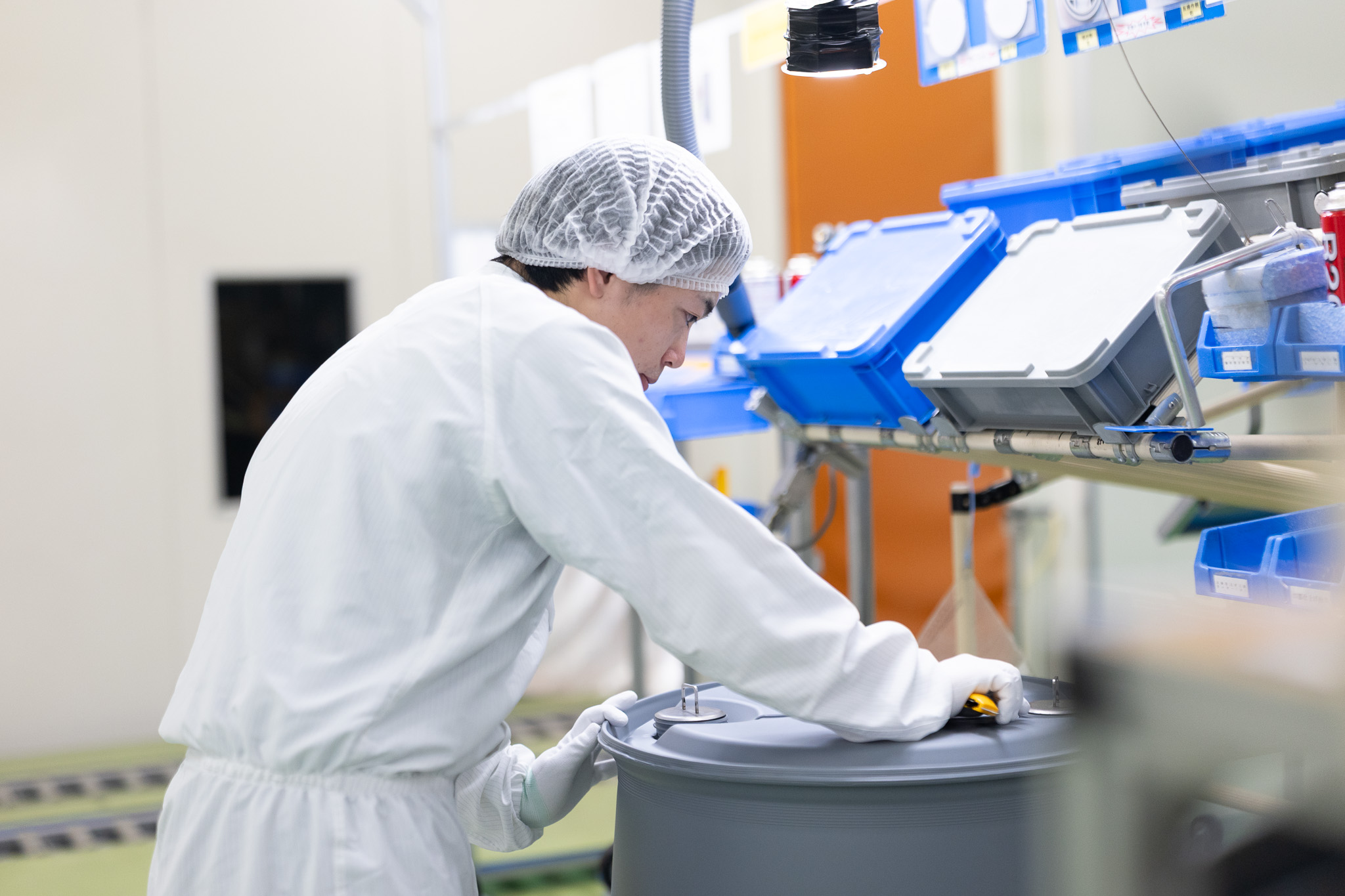 私の業務は、液体輸送容器に異物や基準外のものがないかを検査し、仕上げることです。1日に100〜200個を、次の容器が流れてくる前に正確に検査します。4人1班のチームで交代勤務をし、30〜40種ほどの製品の検査を行っています。